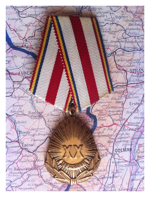 Flag_of_Romania_(1952-1965)This is yet another commemorative issued by the Communist government of Romania. It seems that all the Warsaw Pact countries continued to stamp out these medals at regular intervals. Perhaps to rub it into the West that they had played a large part in Germany’s defeat. As a side note, since the Romanians spent most of the war under the Axis perhaps this medal could also be described as commemorating 20 years of subjugation by the Communists?