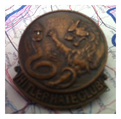 This badge, depicting a lion attacking a snake with Hitler’s head, obviously belongs to some obscure British jingoist “club”. A lot of Home Front propaganda items were produced in the first year of the war, partly to stir up pro-war fervour, mostly to generate a profit. The badge has the words “Protected Design” on the rear. Despite using my l33t googling skills I have not been able to discover an origin for the badge. This example is intended for men as it has the buttonhole attachment. There is a women’s pinback version as well.