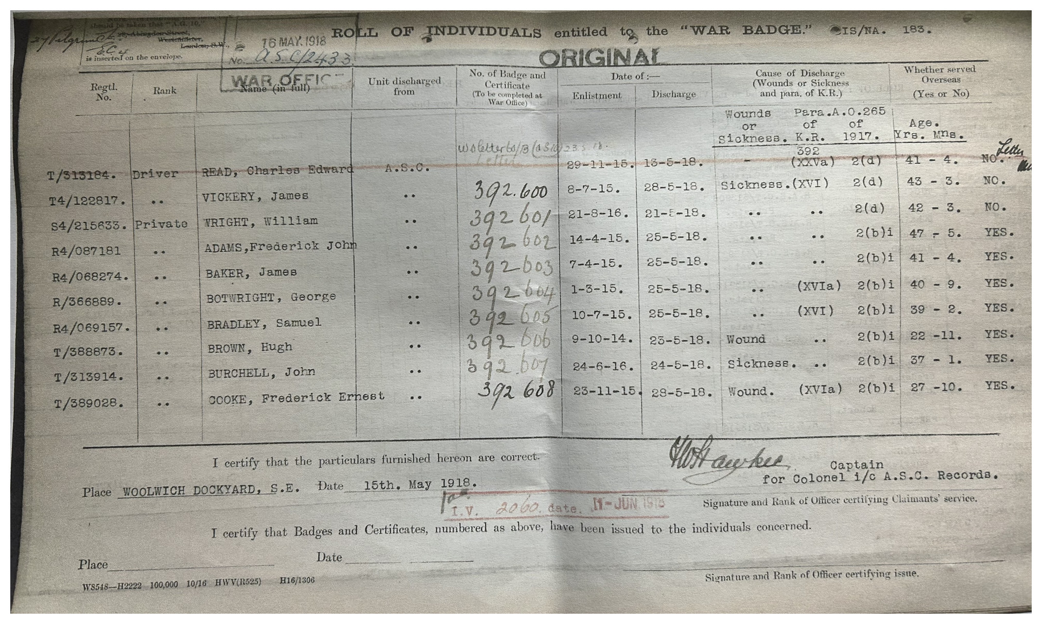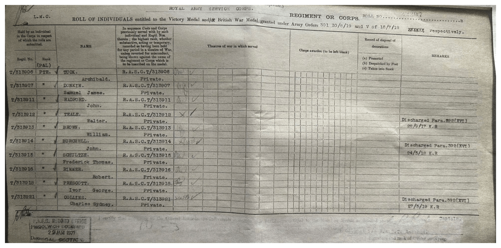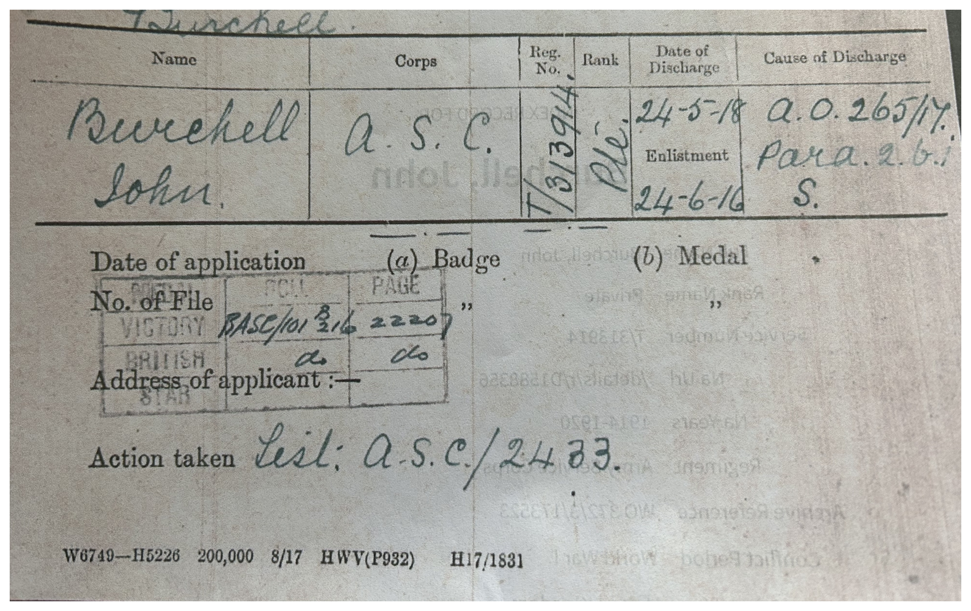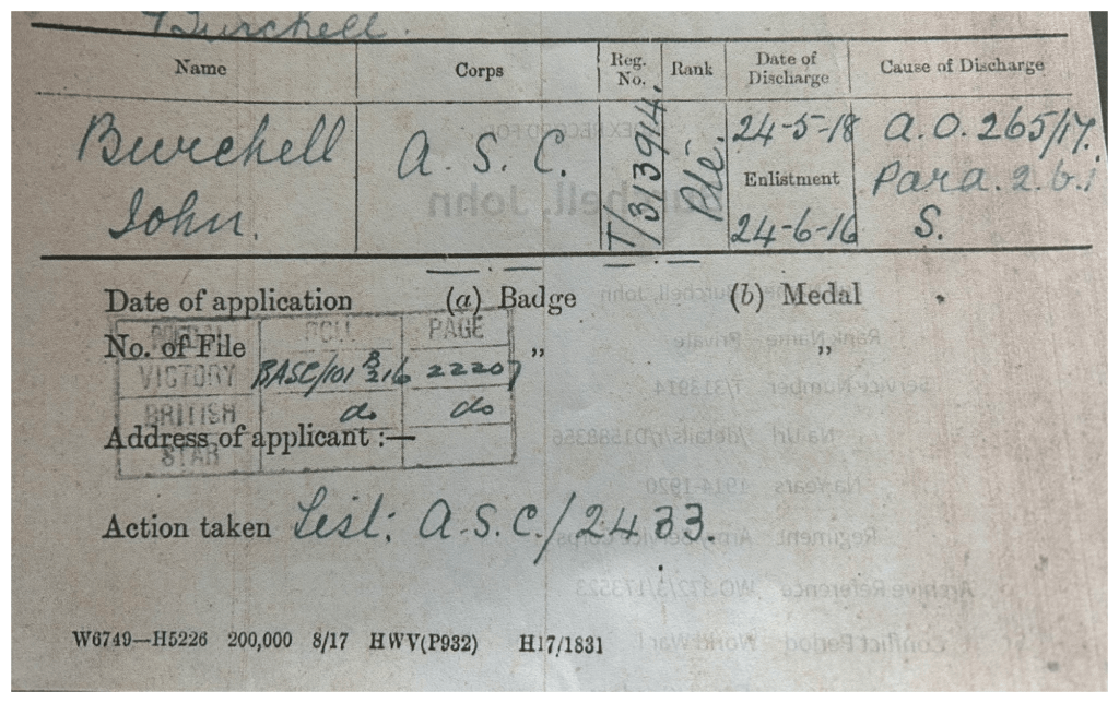 This is a common scenario for me. I find another family member’s medal but it’s an orphan. Especially true of the WW1 pairs. I often end up with either the BWM or the VM. Not often both of them. It makes me wonder how they got split up. In this case it’s a humble BWM for John Burchell, T-313914, a private in the Army Service Corps. John was also entitled to the SWB 392607. He was invalided from the Army on under Paragraph 392 (xvi) 2(b)i, sickness. Looking at his discharge papers its apparent his eyesight had begun to fail. His medical report shows a man with numerous wear and tear injuries. I think the Army just wore him out. He was 37 when he was discharged, too old for the game.