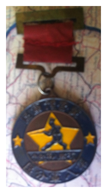 Flag_of_the_Republic_of_ChinaThis is an odd one. It seems to have the same front as the Nationalist commemorative medal but the back is completely different, having the year 1945 and a reference to the defeat of Japan. I have posted this to a China medal subforum so hopefully I’ll hear soon. My thoughts right now are tourist fake from China.