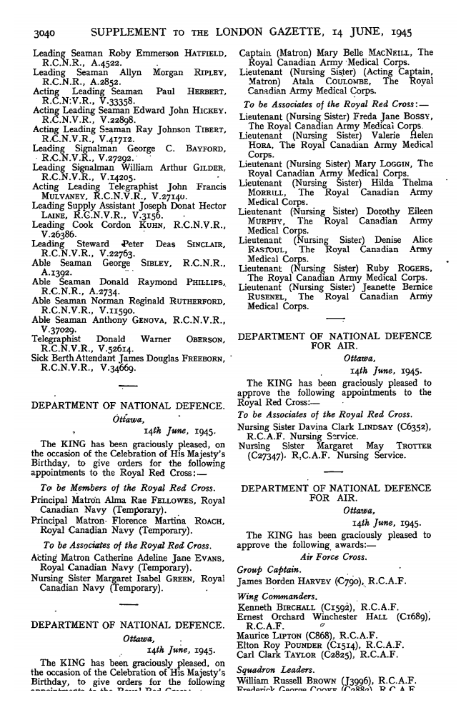 The Ottawa Journal records his promotion to Flying Officer (Temporary) in January 1940. He went on to complete two tours in bombers over France and Germany and then returned to Canada. He served as the Chief Instructor at No.2 Bombing and Gunnery School at Mossbank in Manitoba. In the 14 June 1945 London Gazette he was gazetted for the Air Force Cross (AFRO 1127/45 dated 6 July 1945). Ken had completed 1,502 hours flying as of date of award. The award was presented 1 April 1949.