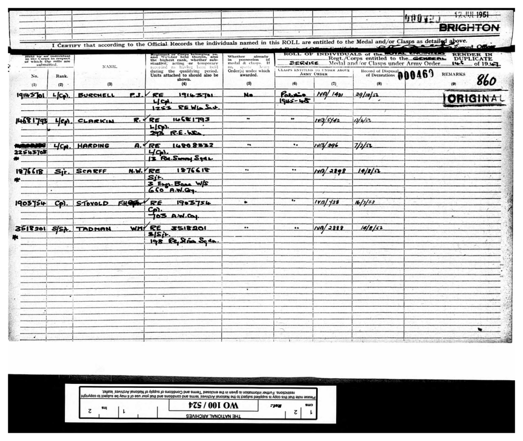 It seems to be the year for orphans with this lonely General Service Medal (1918) with the bar for Palestine 1945-48. This particular example is impressed to 19143701 SPR P.J.BURCHELL R.E. As you can see by the medal roll Sapper Burchell made it to Lance Jack by the time the medal was issued. I have a Naval GSM to the same surname with the same bar.