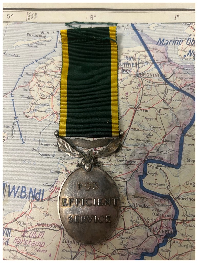 This medal is a GVI Canadian Efficiency Decoration awarded to Wing Commander Kenneth Birchall (C1592). Ken was born in Ottawa on the 17th of March 1916. He attended the technical school in Ottawa and went on to become a Pilot-Sergeant in the RCAF, later enlisting in 1939 in Dartmouth, Nova Scotia.