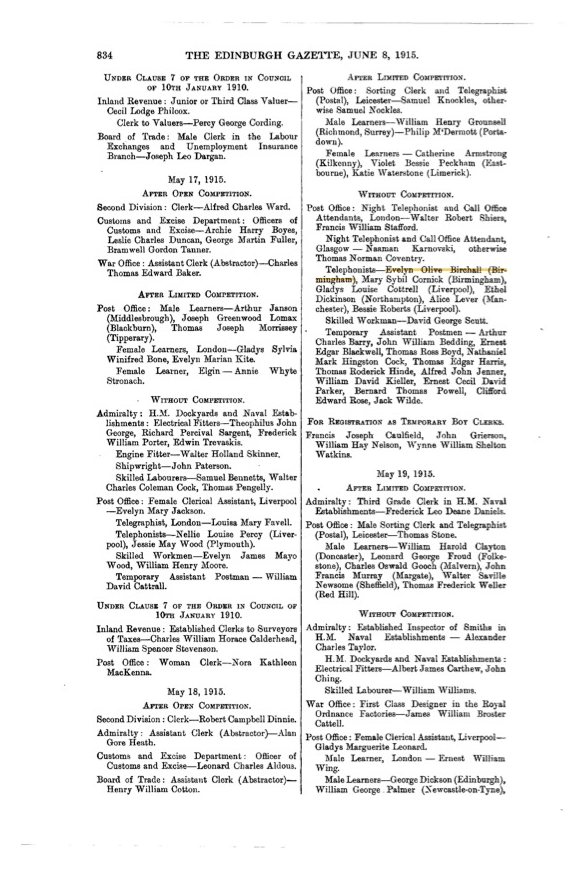 In my unrelenting hunt for medals to my surname I occasionally come across these Imperial Service Medals. Usually they are terrifically hard to find any real info on as the recipients are often faceless career public servants. This one here is named to a Miss Olive Birchall. I couldn’t find her in the gazette although I did find her entry into the Post Office as a telephonist in 1915.