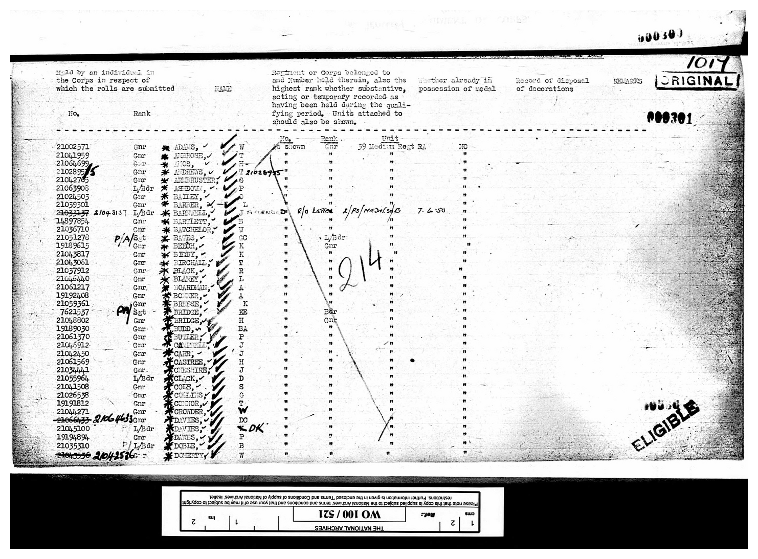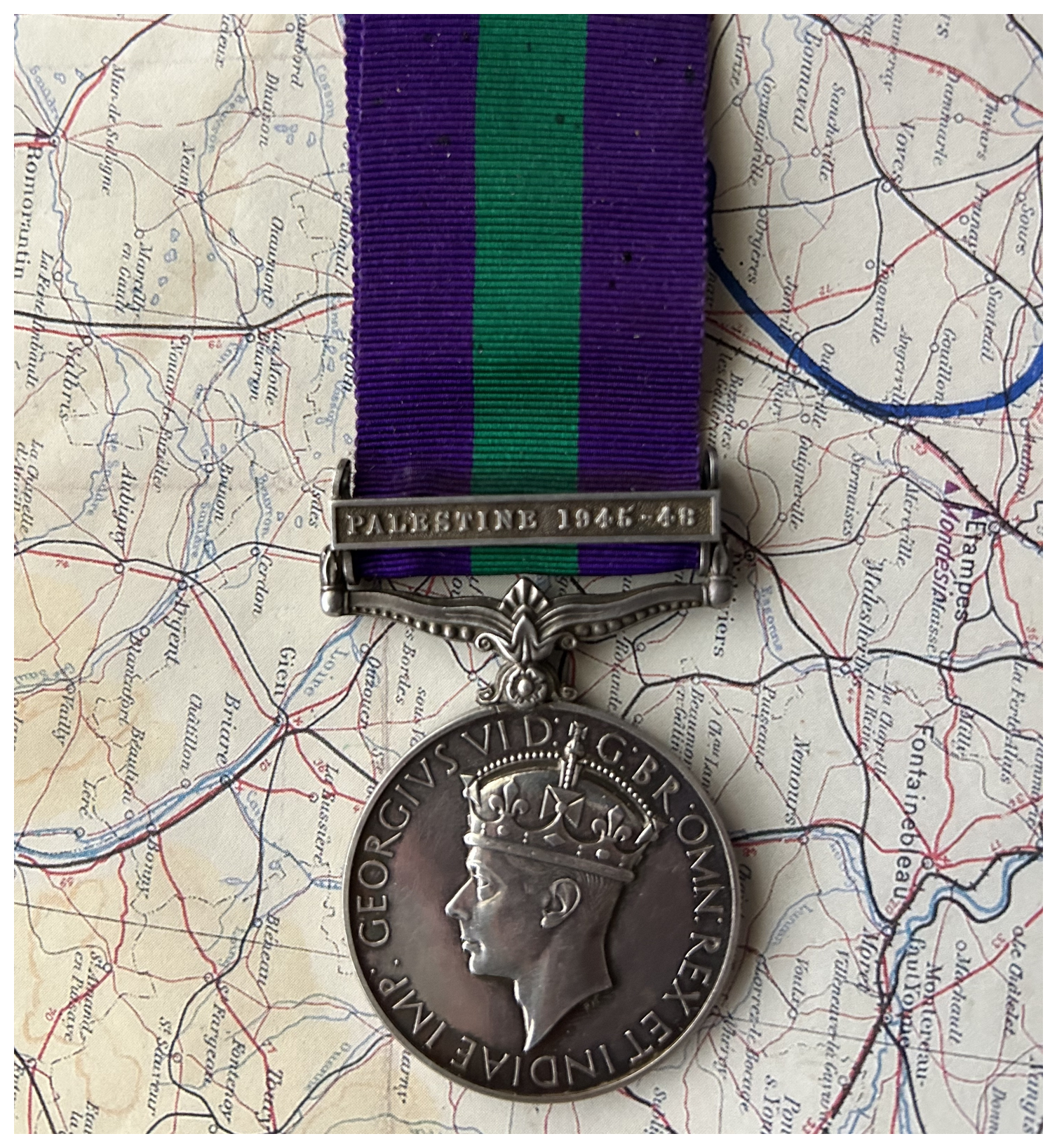 Yet another GVI General Service Medal with a 1945-1948 Palestine Bar attached. This is the GSM (1918) Medal with bar to Palestine 1945-1948 issued to Gunner T. Birchall, 21043061, Royal Artillery. He served in the 39th Medium Artillery Regiment.