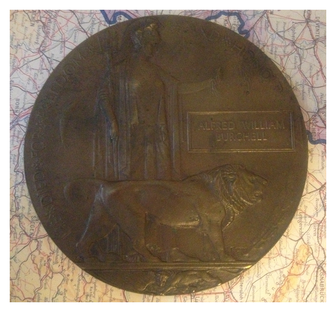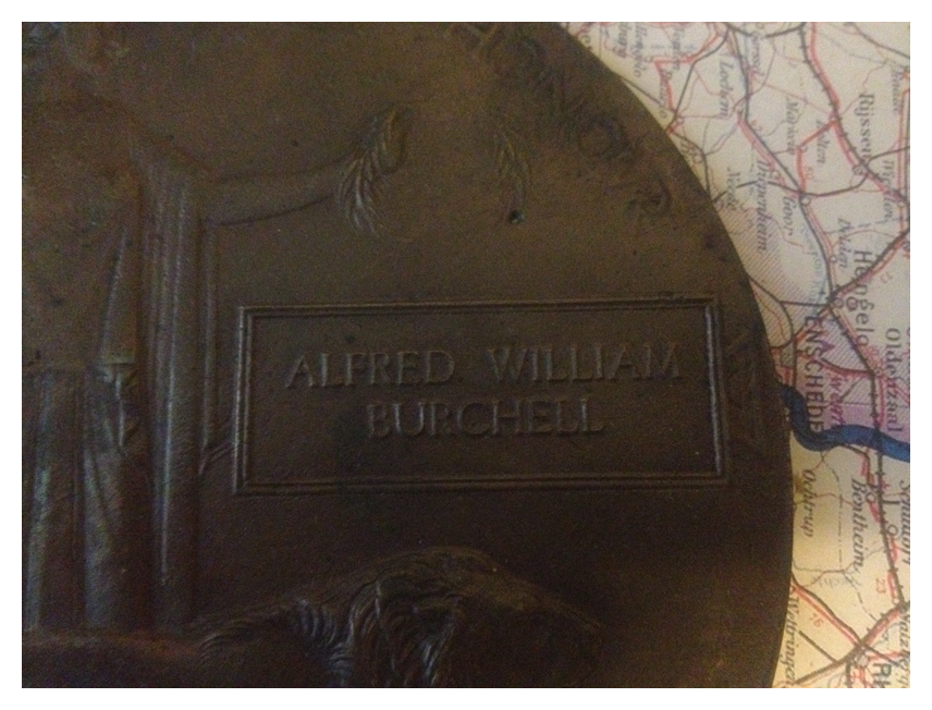 This memorial plaque (also called a Dead Man’s Penny) commemorates the death of Private Alfred William Burchell 8121. Alfred, born in Tottenham, London, was a member of 2nd Battalion Kings Own Yorkshire Light Infantry and was killed on the 17th of November 1914 during the last stages of the 1st Battle for Ypres in Belgium. His body was not recovered and he is commemorated on the 47th panel of the Menin Gate Memorial in Ypres. Also shown is the original wax cardboard sleeve these plaques were shipped in.