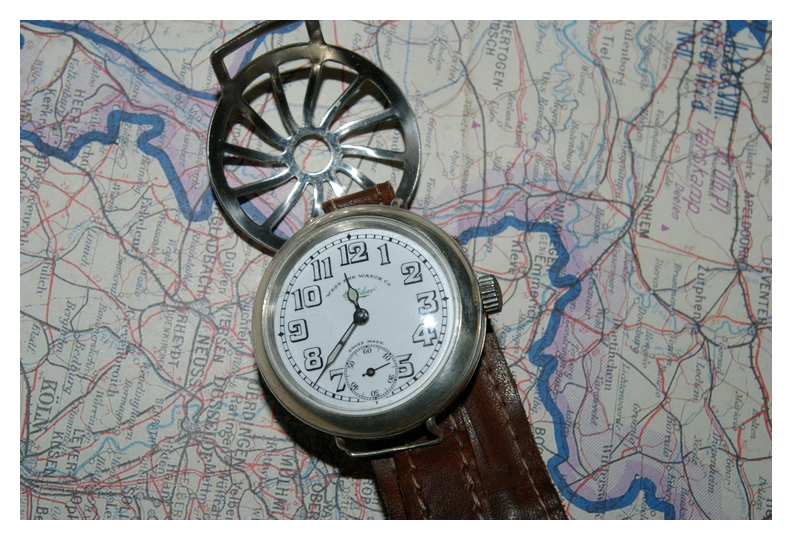 This watch, by West End Watch Company, is a “Silidar” model, near the top end. It has an enamel face which dates it to prior to WW2. The watch case is the classic trench watch type, raised.