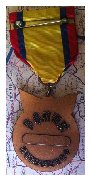 Sometimes called the China War Memorial Medal, this medal was authorized by the Chinese Nationalist Government for issue to all servicemen and others who assisted the Chinese in their fight against Japan during the Second World War. It was awarded to both military and civilian personnel who were directly involved in the war effort. Perhaps the largest single group of Americans to receive this medal were members of the 14th Air Force, the famed “Flying Tigers.” This medal was presented to them in a special ceremony during a convention of the 14th Air Force Association held in New Orleans on August 2, 1975. The medals were formally presented to about 200 veterans by the Ambassador of the Republic of China and Anna Chennault, the widow of General Claire L. Chennault, the former commander of the Flyng Tigers.
