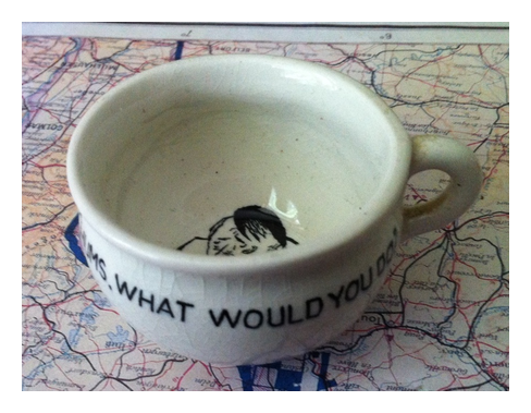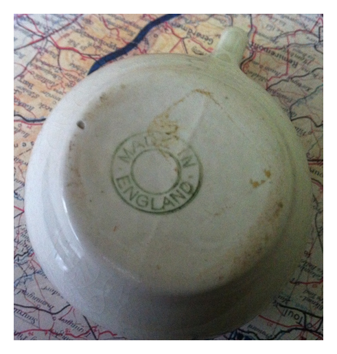 This is another one of a series of faux chamber pots put out by imitators of Fieldings of Staffordshire, England early in 1939 to take advantage of the, then recent, “Violation of Poland” by Hitler’s armies. It is slightly larger in size than the other example I have. On the front it says ‘Chums, what would you do?”. Inside is a cartoon image of Hitler, this time not by David Low. The design is a tongue in cheek one imitating the more common Fieldings designs. These are not as well executed as the Fieldings/Crown Lynn ones.