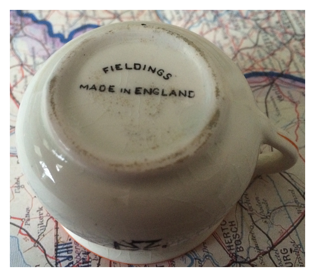 This is the fourth one of a series of faux chamber pots put out by Fieldings of Staffordshire, England. On the front it says ‘Wop No. 1” and “Albania-Taranto-Bardia”. On the rear it says “We’ve got him on the run″. Inside is a cartoon image of Mussolini. The design is a tongue in cheek one executed by the outstanding designer Enoch Boulton. These pots were viewed as being a little bad taste at the time, especially the ultra-rare large one that rotated on a wooden base and played “Rule Britannia”. I truly wish I could find that one someday. The date of this piece is sometime between November and December 1940 since this is when Bardia fell to General Wavell and the Italian Fleet was torpedoed at Taranto. These Mussolini ones are much harder to find than the Hitler ones.