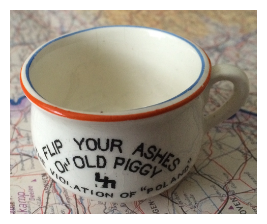 This is the third one of a series of faux chamber pots put out by Fieldings of Staffordshire, England early in 1939 to take advantage of the, then recent, “Violation of Poland” by Hitler’s armies. It is slightly larger in size than the other example I have. On the front it says ‘Flip Your Ashes On Old Nasty” and “The Violation of Poland”. On the rear it says “Gets-a-po″. Inside is a cartoon image of Hitler, probably by David Low, a prominent political cartoonist of the period. The design is a tongue in cheek one executed by the outstanding designer Enoch Boulton. These pots were viewed as being a little bad taste at the time, especially the ultra-rare large one that rotated on a wooden base and played “Rule Britannia”. I truly wish I could find that one someday.