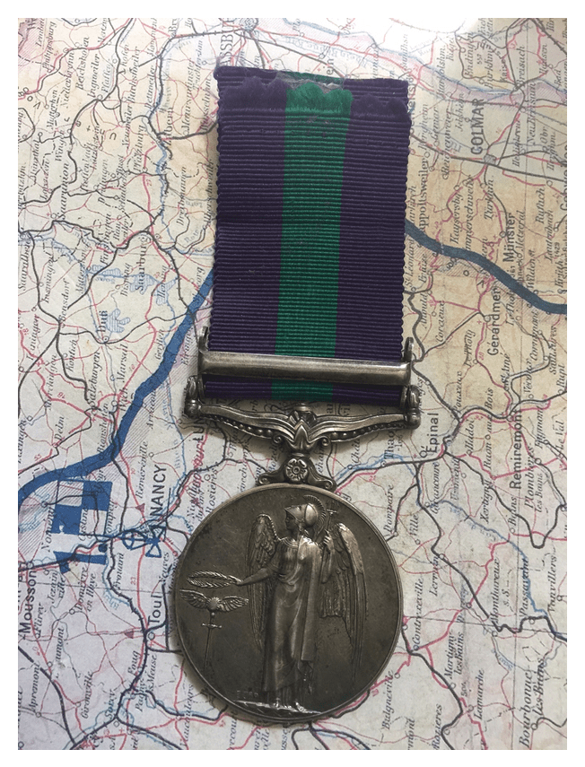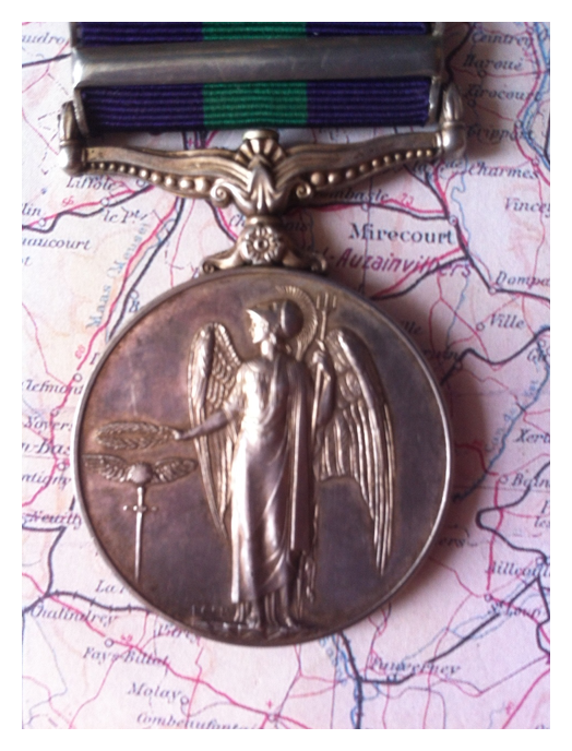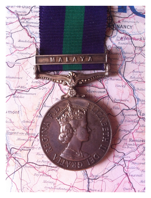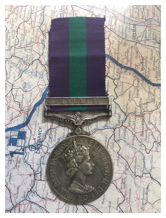 Here’s one that got caught up in the Canada Post strike and took two months to get to me. A lonely little General Service Medal with Malaya Bar impressed to 23334034 Pvt G. Birchall of the RAOC.