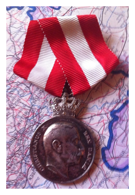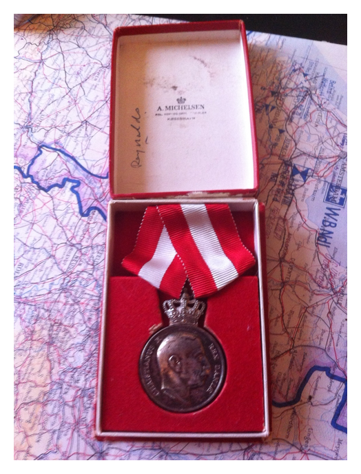 This medal was instituted on 5 May 1946 and bestowed on some 3,100 persons who had rendered special services to Denmark during the German occupation. This particular example is marked to the surname Reynolds on the inside of the case. When I look this up in the Danish “Hof-og Statskalender” the only Reynolds awarded this medal is Squadron Leader Reggie Reynolds CO of 139 Squadron RAF flying Mosquitos.