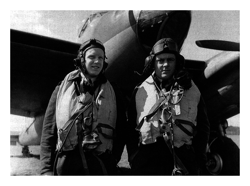 First up a photo of Sismore (left) and Reynolds (right) in front of a Mosquito aircraft.