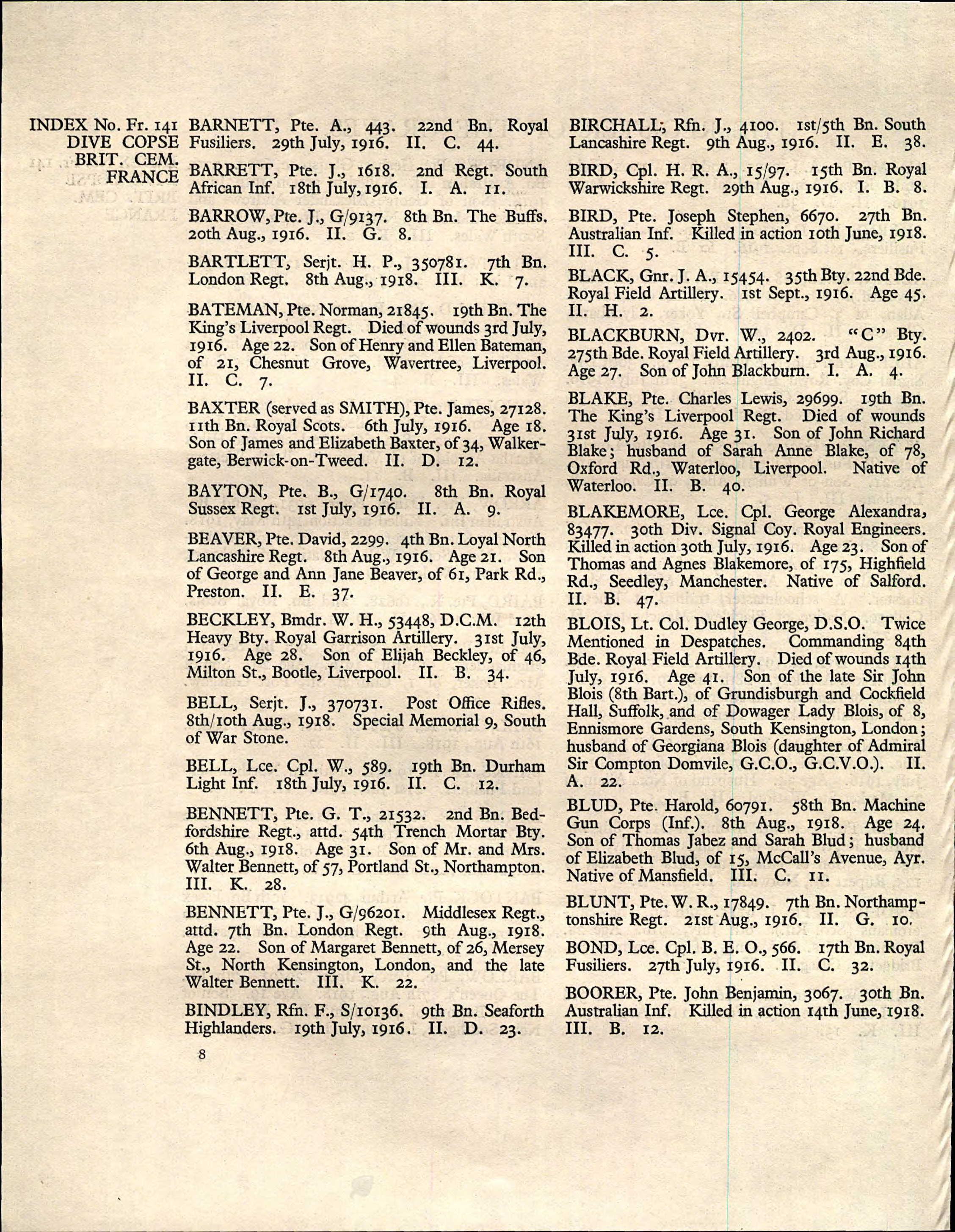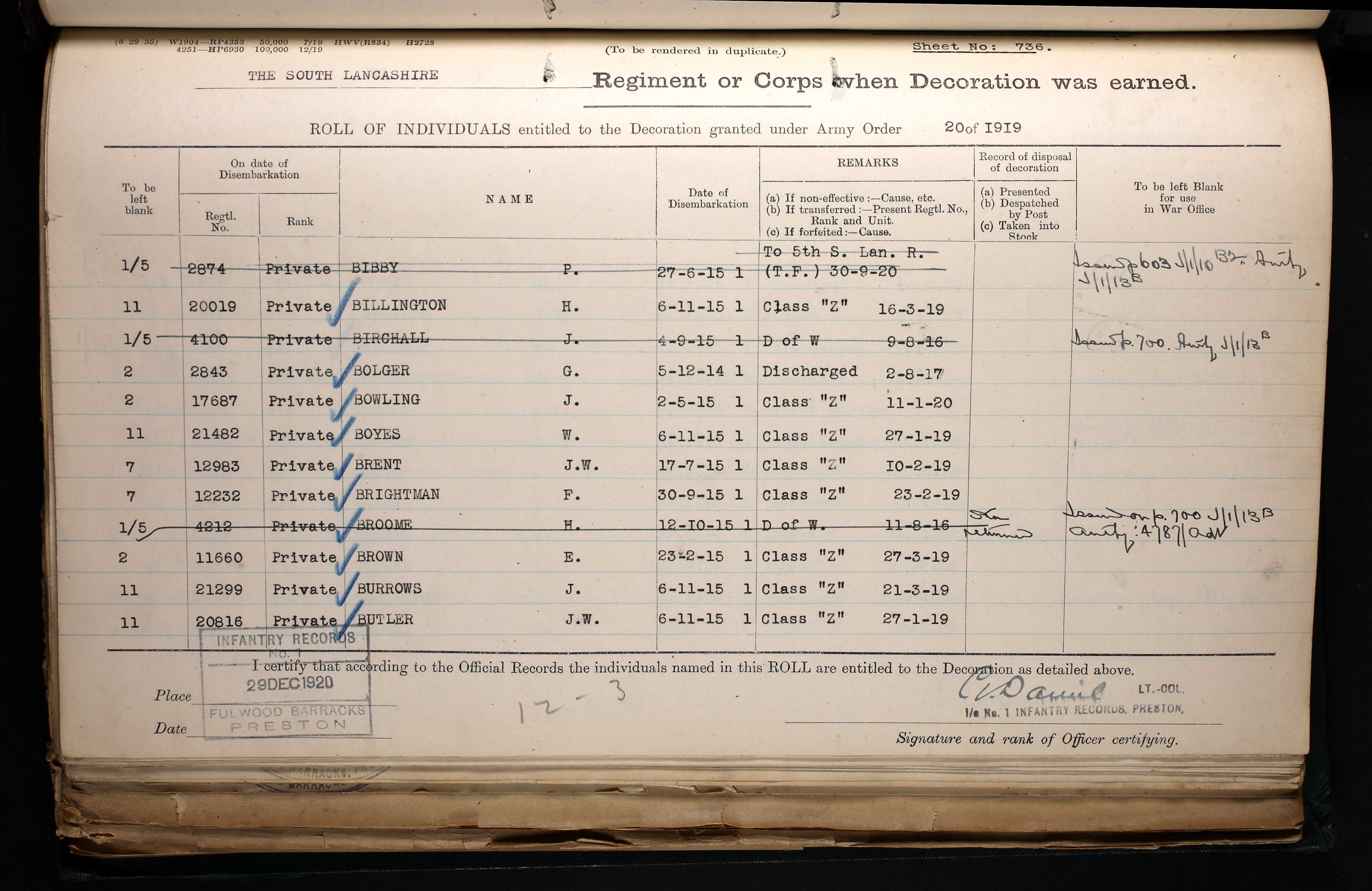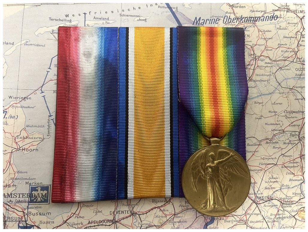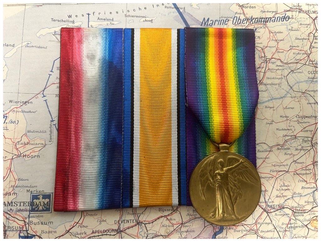This is the Victory Medal for Private J. Birchall of the Prince of Wales’s Volunteers (South Lancashire) Regiment, 4100. He entered France on the 4th of September and he was killed in action on the 9th of August 1916 and is buried at the Dive Copse British Cemetery, Sailly-Le-Sec.
