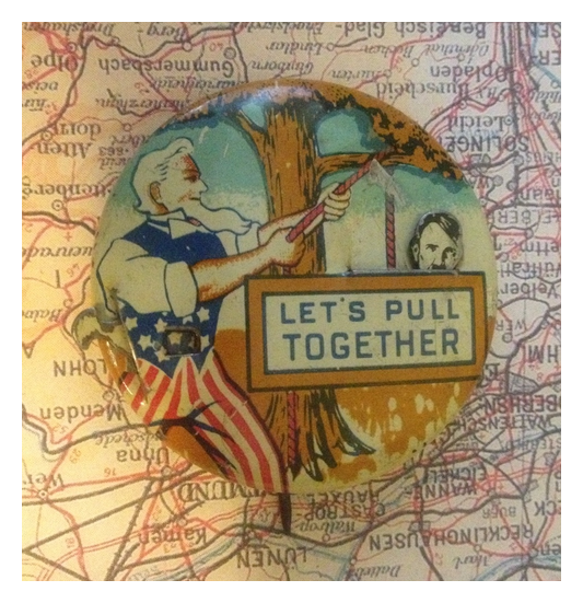 This fun little pinback, manufactured in the US, originally had a piece of red cotton thread attached to the lever on Uncle Sam’s hip. When you pull it Hitler’s head was raised as though he was being hung from the tree. Just wonderful!